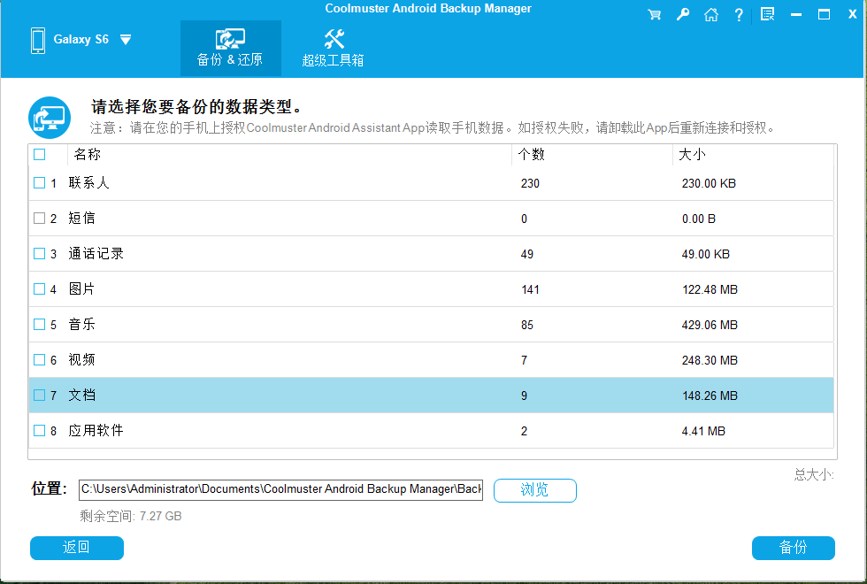 方式 2. 使用Android备份管理器将照片从 Moto 传输到 PC如果您想将所有图片从摩托罗拉手机传输到计算机进行备份, Coolmuster Android Backup Manager也是适合您的工具。它提供了一种快速、简单的解决方案来将Android文件备份到 PC 。借助它的帮助,您还可以将备份文件恢复到摩托罗拉或任何其他连接的Android手机。它支持联系人、消息、通话记录、照片、音乐、视频、文档和应用程序。您可以选择要备份的文件类型并将其保存在计算机上的自定义位置。