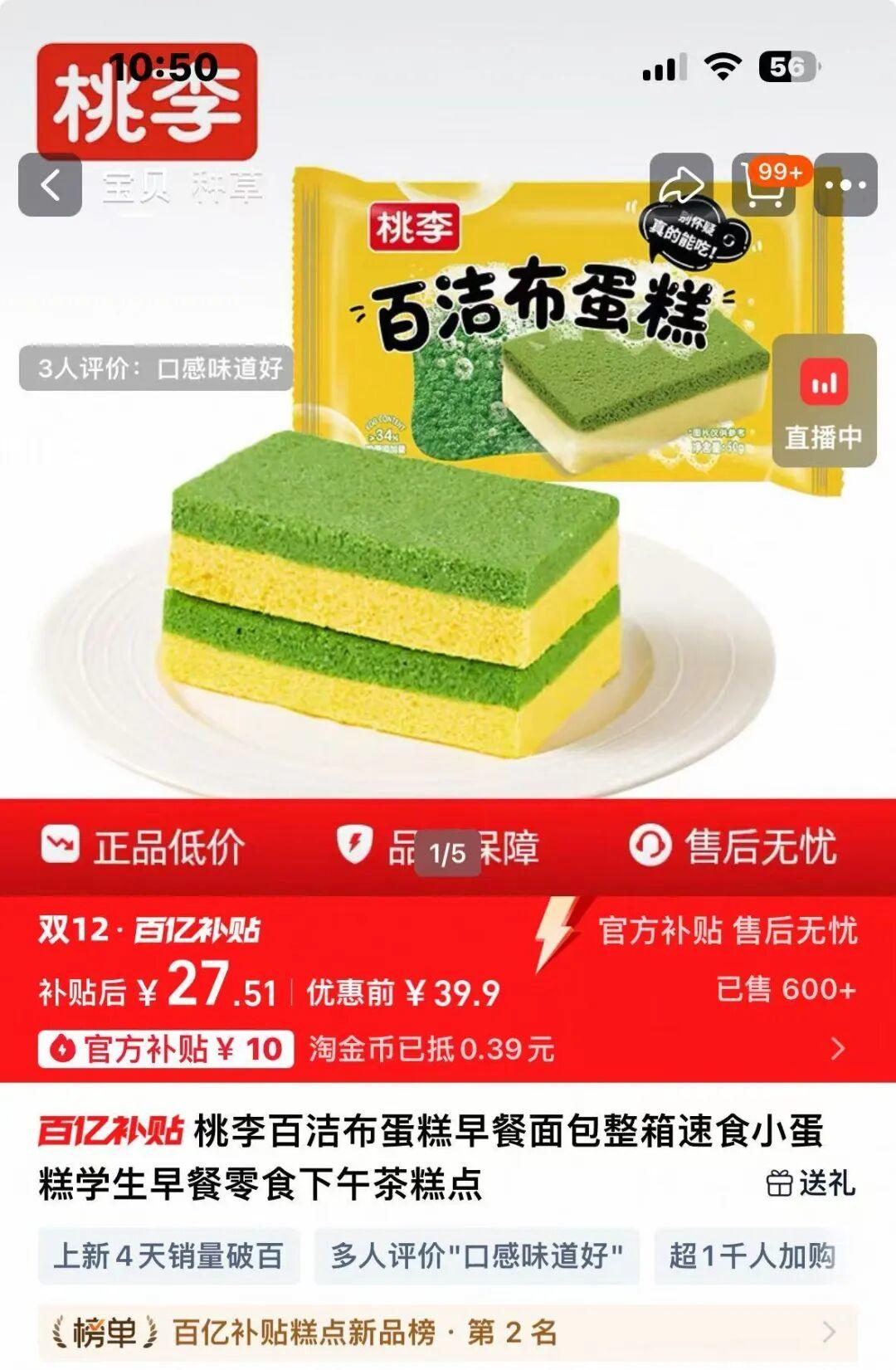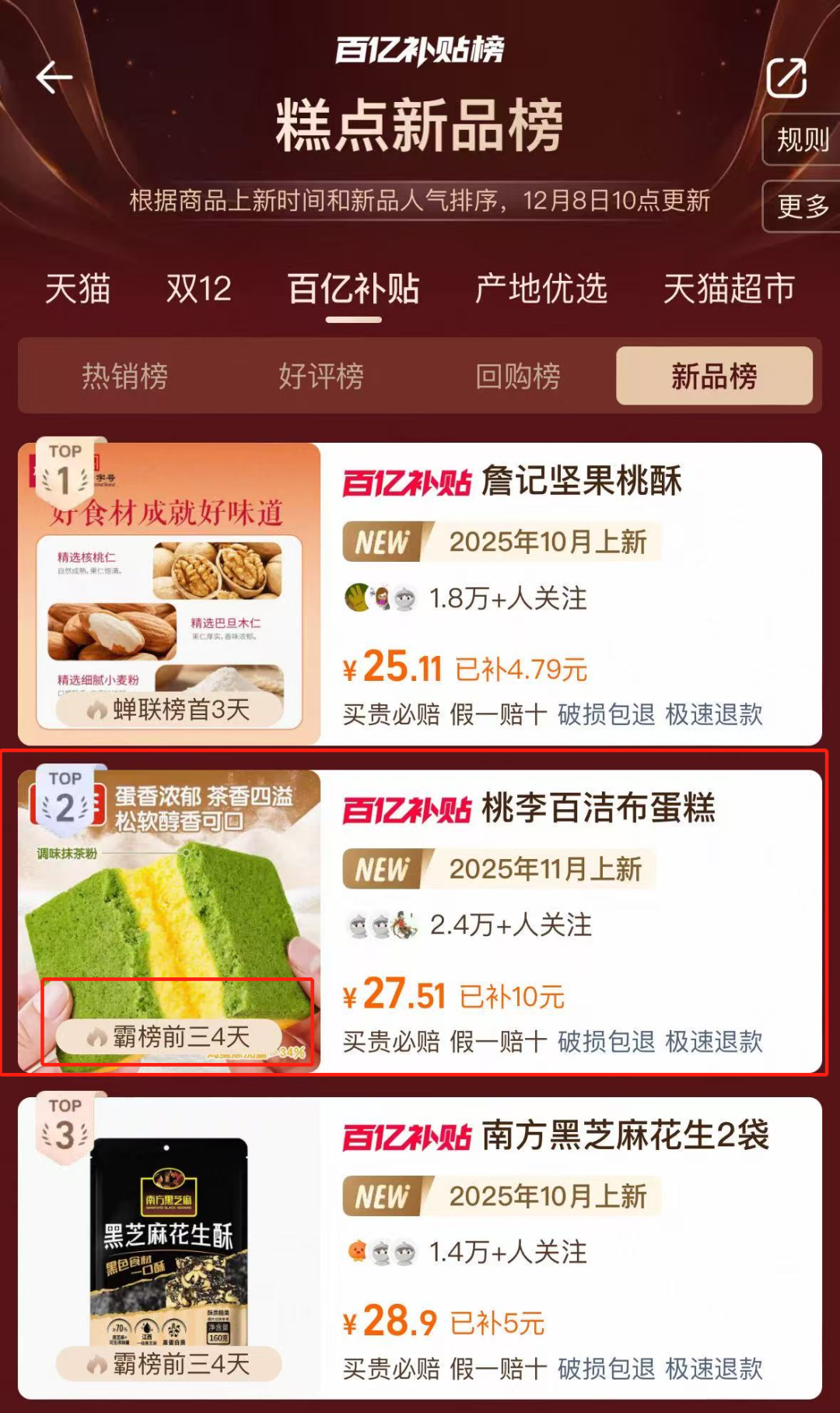 不过,我还发现,在淘宝百亿补贴帮糕点新品榜上,桃李面包的百洁布蛋糕排名第二,并且连续4天霸榜前三,而这个榜单是根据商品上新时间和新品人气排序。