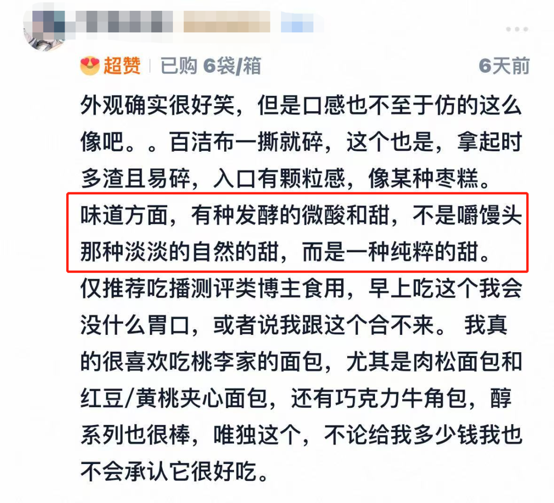 究其原因,可能和口味有关。点开产品详情页,会发现用户评价中给出好评的人并不多,有人肯定其外观设计的同时,认为“和好吃不沾边”“有种发酵的微酸和甜”,其中不乏桃李面包的忠实用户。