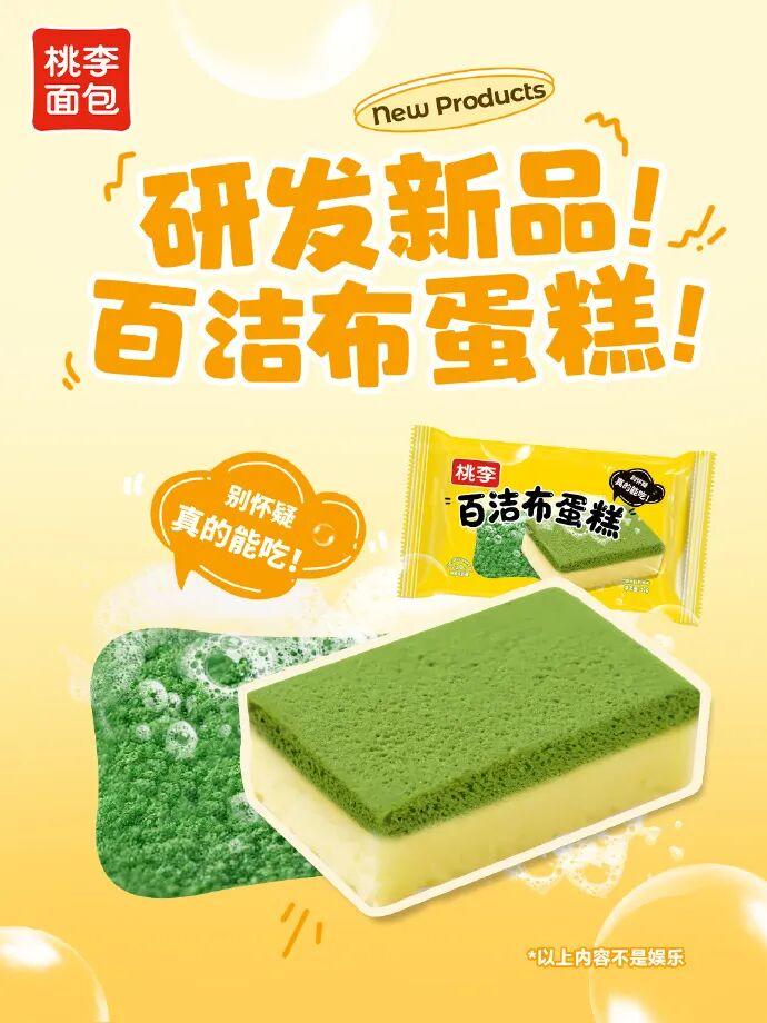 黄绿配色,海绵质地,配上包装上“百洁布蛋糕”五个大字,当一块长得和百洁布以假乱真的海绵蛋糕出现在桃李面包旗舰店,所有生活小妙招的博主都要甘拜下风。