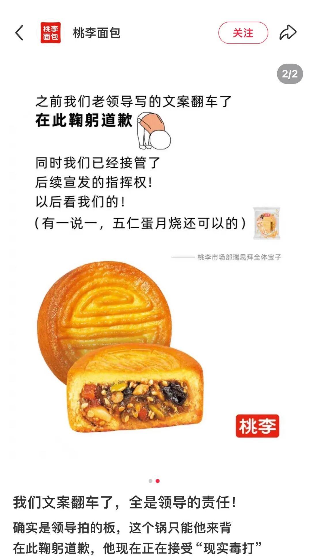 月饼文案翻车后,桃李面包曾迅速下架广告并致歉,承认“文案翻车”,让老领导“鞠躬道歉”,还宣布后续宣发由年轻人接管。