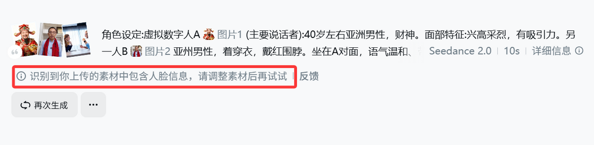 三是超写实内容的出现,必将催生黑灰产。Seedance 2.0在2月9日更新后, 已经没法上传真人人脸了。我在视频制作中,确实遇到了这个问题。但这也并非不可跨越。我把照片用AI进行了一下处理,去掉了人物背景,再用生成的人物正面照作为参考图,就顺利通过了。近期一些AI视频涉及周星驰、沈腾等人的内容,表面上看是版权争议,骨子里却是人类对虚拟与真实之间界限的反思。在一些以假乱真的视频面前保持清醒和判断,是需要内容消费者、平台方、监管方等全社会需要面对的现实问题。