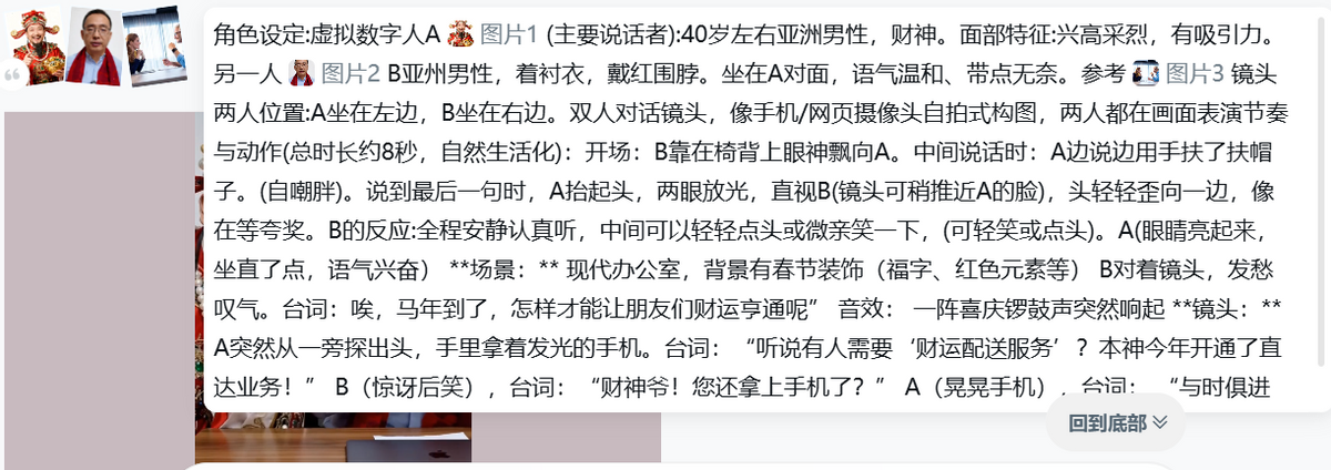 比如我想请财神爷和我一起出镜,给屏幕前的朋友们送上祝福。那就涉及两个角色,一个我本人,一个财神爷。所以在人物设定时,就要给出每个人物的特点,包括国籍、年龄、着装、动作、表情等。