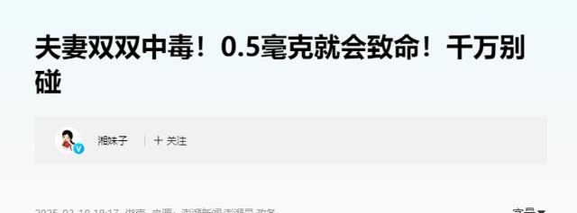 湘妹子2025年3月19日---夫妻双双中毒!0.5毫克就会致命!千万别碰