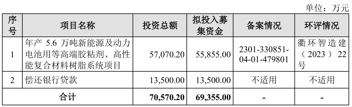 新版招股书(第二版和第三版)中,道生天合拟募资6.94亿元,“年产5.6万吨新能源及动力电池用等高端胶粘剂、高性能复合材料树脂系统项目”和“偿还银行贷款”分别拟投入募集资金5.59亿元、1.35亿元,募资额缩水且募投项目发生变动。
