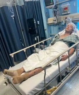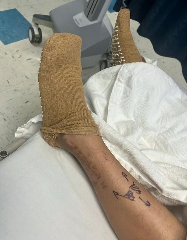 另一张照片则是他躺在病床上,闭着眼睛休息的照片,他的鼻子边放着氧气管,受伤的腿裹着厚厚的纱布。裸露的脚踝处狰狞的伤疤和清晰的手术标记。