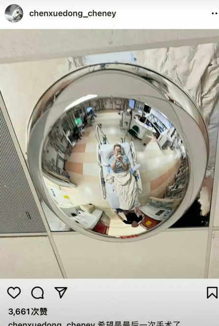 近日,久未露面的陈学冬在社交平台晒出一张病床自拍照,他写道:“希望这是最后一次手术了。”照片中,他身穿浅蓝色病号服躺在手术室里,脸上带着明显的疲惫感。