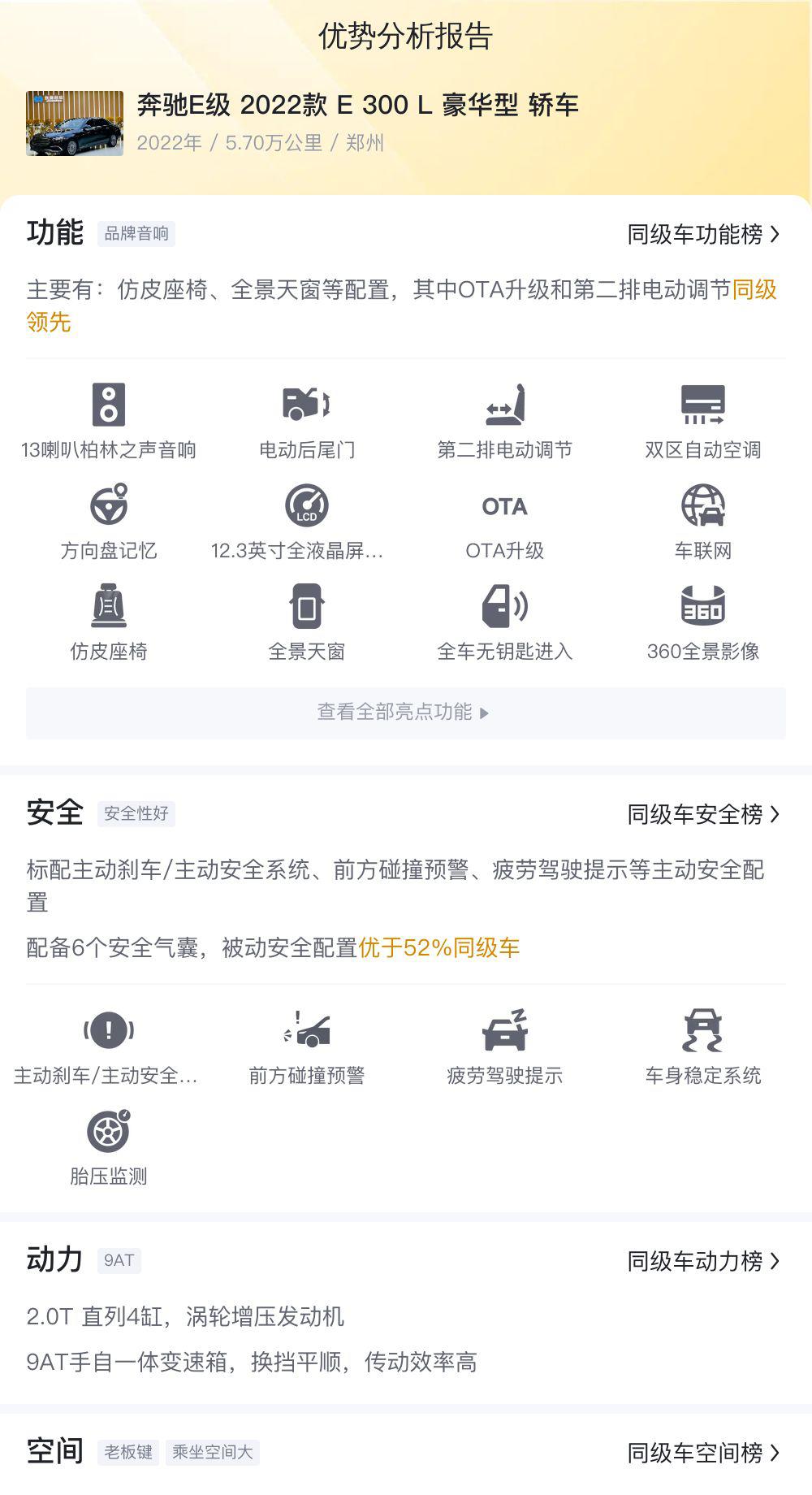 最后,这辆车的价格也极具吸引力。36.88万的价格,相比新车价格,有着明显的优势。对于那些预算有限,又想体验奔驰E级豪华的消费者来说,这辆二手车无疑是一个非常不错的选择。