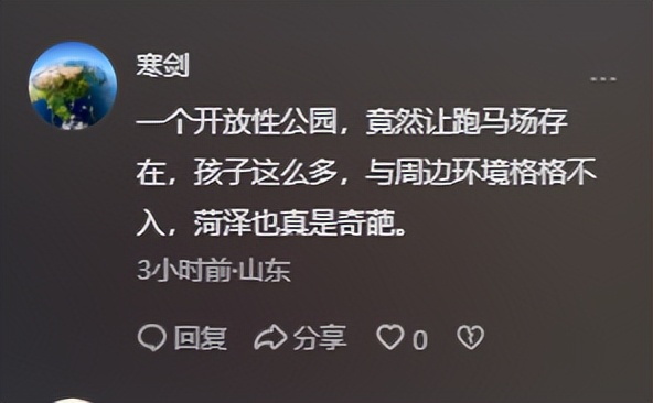 还有网友说,一个开放性公园,竟然让跑马场存在,孩子这么多,与周边环境格格不入,也真是奇葩。