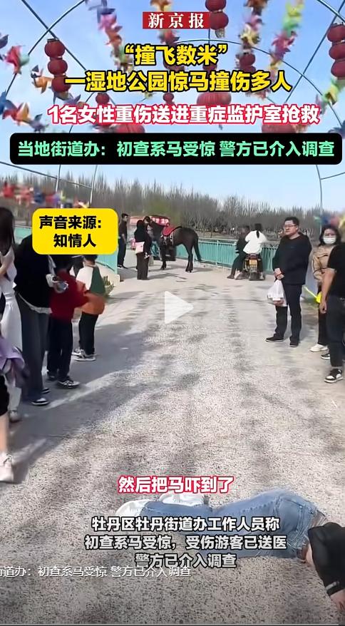 3月22日,山东菏泽一湿地公园,发生一起惊马撞人事件,据现场目击者描述,这个公园是开放性的湿地公园,旁边有个私人跑马场,从去年下半年开始,就有不少马场可以给游客提供骑马服务,由于是星期天人特别多,马匹因人多失控,马受惊了,把游客摔下来,教练也只顾着游客,没顾上马,所以让马自己疯跑出去,撞伤了很多游客,其中一个女孩最为严重。女孩当时躺在地上一动不动,脸上脖子上都有血迹。没有看到明显的伤口,可能是因为被马撞到受了内伤,因为出血的地方是在头部。公园的工作人员看到后,赶紧过来查看女孩的情况,并拨打了120。目前女孩还在icu救治。