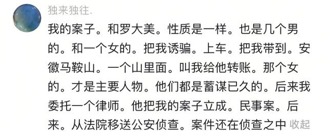 还有网友透露自己遇到过相似的案件,也是几个男的和一个女的把他诱骗上车,把他带到安徽马鞍山一个山里面让给他转账。那个女的才是主要人物,他们都是蓄谋已久的。后来我委托一个律师,把我的案子立成民事案,后来从法院移送公安机关侦查,现在案件还在侦查之中。