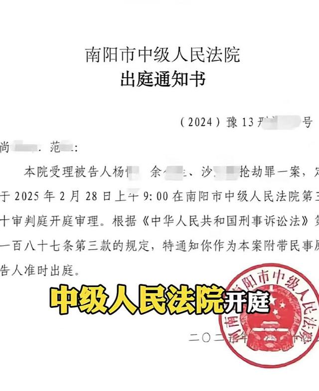 2025年2月28日上午,该案在河南省南阳市中级人民法院开庭审理。南阳市检察院以余某生、沙某姣、杨某涉嫌抢劫罪,余某生涉嫌故意杀人罪提起公诉。