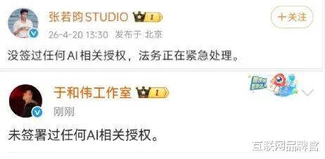 但问题很快就来了。消息公布后,张若昀工作室第一个站出来辟谣。“没签过任何AI相关授权,法务正在紧急处理。”紧接着,于和伟、王楚然、李一桐的团队也纷纷发声否认。