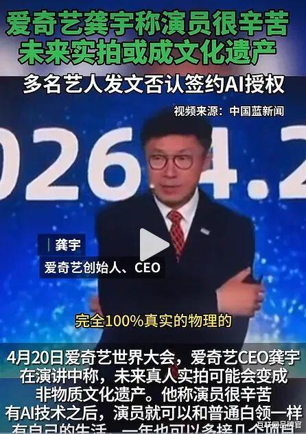今天,娱乐圈炸了。爱奇艺在2026世界大会上扔下了一颗重磅炸弹。平台宣布与117位艺人签署AI授权协议,要打造一个庞大的AI艺人库。消息一出,全网沸腾。更劲爆的是爱奇艺CEO龚宇的一句话。他说,未来真人实拍可能会成为“非物质文化遗产”,这话直接点燃了舆论火药桶。爱奇艺这次玩得很大。他们推出了一个叫“纳逗Pro”的专业影视制作平台。按照官方说法,已经有117位艺人入驻这个AI艺人库。平台的想法很简单。艺人授权自己的形象、声音等数据,平台用这些数据生成数字分身。以后拍戏,可能就不需要真人到场了,AI可以代替演员完成表演。听起来很美好。演员不用再辛苦拍戏,一年能从拍4部戏变成14部戏,还能有更多休息时间,这是龚宇给出的理由。