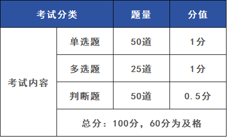 心理咨询师考试为线上机考模式,为一门综合考试,考试题型为单选题50题、多选题25题、判断题50道,考试满分100分,60分为及格线。