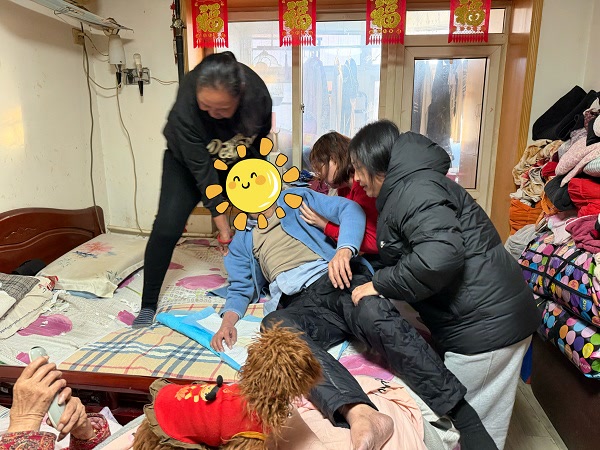 到达现场后,两位社区工作者首先查看了老人的状况,在确认老人意识清醒、没有造成二次伤害的情况下,她们迅速与家属沟通,决定先将老人安全抬到床上。她们与家属分工协作,小心翼翼地托住老人的身体,合力将老人平稳地从冰冷的地面抬到了床上。