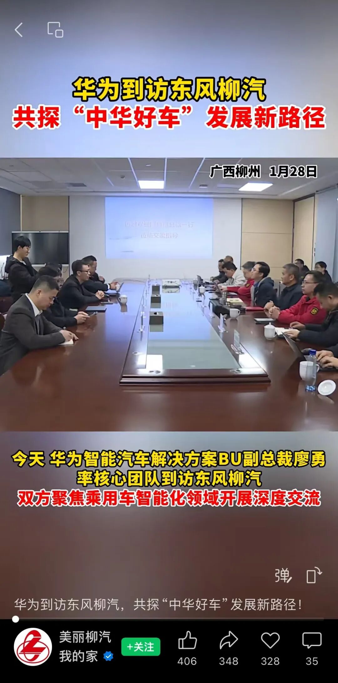 1月28日,东风柳汽官方发布了一则视频。该视频显示华为智能车解决方案BU副总裁廖勇率核心团队到访东风柳汽。在视频中,官方还披露了双方聚焦乘用车智能化领域展开深度交流。经过深入研讨,双方在乘用车重点规划车型加速推进智能化解决方案的适配与落地,后续合作推进路径形成初步规划等方面达成多项共识。未来,双方将按既定规划稳定推进各项工作,持续整合双方优势资源,共同为中国汽车产业新能源转型升级注入动能。