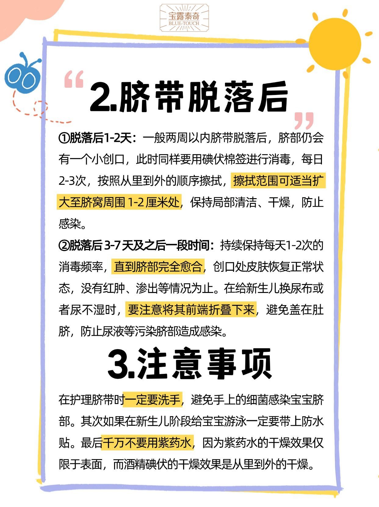 脐带未脱落前出生后 1-2 天:在医院时,医护人员会用无菌纱布覆盖并包扎脐带残端。家长要留意避免纱布被尿液、粪便污染,保持包扎部位清洁,同时观察脐带残端渗血情况,少量渗血属正常,渗血较多需及时告知医护人员。出生后 3-7 天:在医护人员指导下,用棉签蘸取适量碘伏或 75% 酒精,轻轻拉住脐带,从根部开始以螺旋式动作由内向外擦拭脐带及周围皮肤,直径约 3 厘米,每次 2-3 遍,早晚各一次。给新生儿洗澡尽量擦浴,避免脐带沾水,沾水后需用干净软毛巾擦干并碘伏消毒。此外,要持续留意脐带有无异味、发黄、肿胀等异常,发现异常及时就医。脐带脱落后脱落后 1-2 天:一般两周内脐带脱落后,脐部会有小创口,需用碘伏棉签消毒,每日 2-3 次,从里到外擦拭,范围扩大至脐窝周围 1-2 厘米,保持清洁干燥,防止感染。脱落后 3-7 天及之后:持续每天消毒 1-2 次,直至脐部完全愈合、皮肤恢复正常,无红肿、渗出等情况。换尿布或尿不湿时,要将前端折叠,防止尿液污染脐部。注意事项护理脐带部位前一定要洗手,防止细菌感染。新生儿游泳时,一定要戴防水贴。切勿使用紫药水,因其干燥效果仅表面,不如酒精碘伏从里到外的干燥效果好,且可能影响对脐带愈合情况的观察。