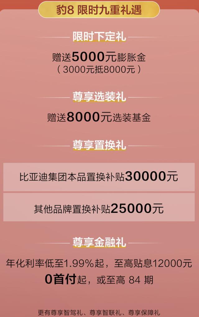 再看豹8,限时下定送膨胀金,选装基金8000块,置换补贴更是大手笔,比亚迪本品牌置换直接补贴3万,其他品牌也有2万5。