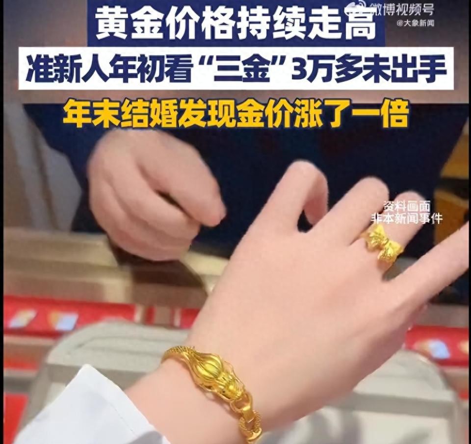 近日,在郑州一金店销售店长告诉@大象新闻 记者,有准备结婚的小情侣在2025年初的时候,来看结婚“三金”,店员给算了总价是3万多元,两人判断金价可能会下调,就说先等等。结果金价一路走高,临近年底结婚两人再来时,同样克重的金饰,价格已经变成了6万多元。
