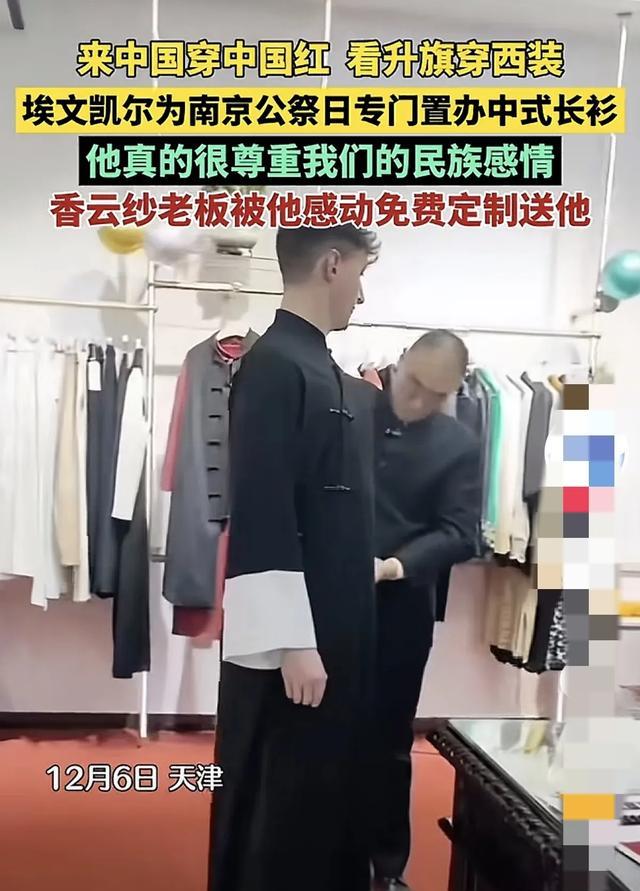 为了参加国家公祭日活动,埃文凯尔已提前为自己准备了那天要穿的衣服。12月6日,埃文凯尔还在天津,他就找了当地的裁缝为自己量身制作一套中式长衫,当时,店铺老板被埃文凯尔的行为感动,决定免费为他制作。埃文凯尔虽然说是外国人,但他很尊重我们的文化,他是一个大高个,穿上中式长衫相当好看。