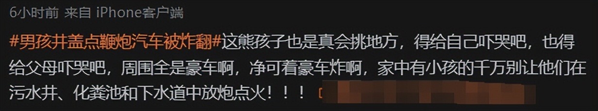 ——一名小男孩放鞭炮炸化粪池,没想到威力十分惊人,竟把附近停放的好几辆豪车都给炸到了!且损失惨重,估计赔偿金额在150万到250万人民币之间,这下就算卖房子都不够赔的啊!