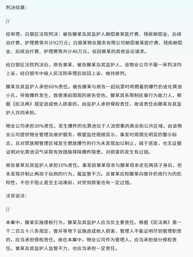 在2021年,甘肃白银区就发生过类似的鞭炮井盖爆炸事件,法院判定小孩及其监护人需负主要责任,并赔偿受害方近百万元。通过这起判决可以看出,家长在此类事件中通常承担的赔偿责任是巨大的,也是最大的,基本跑不了,尤其是当事故涉及到高额的财产损失时。