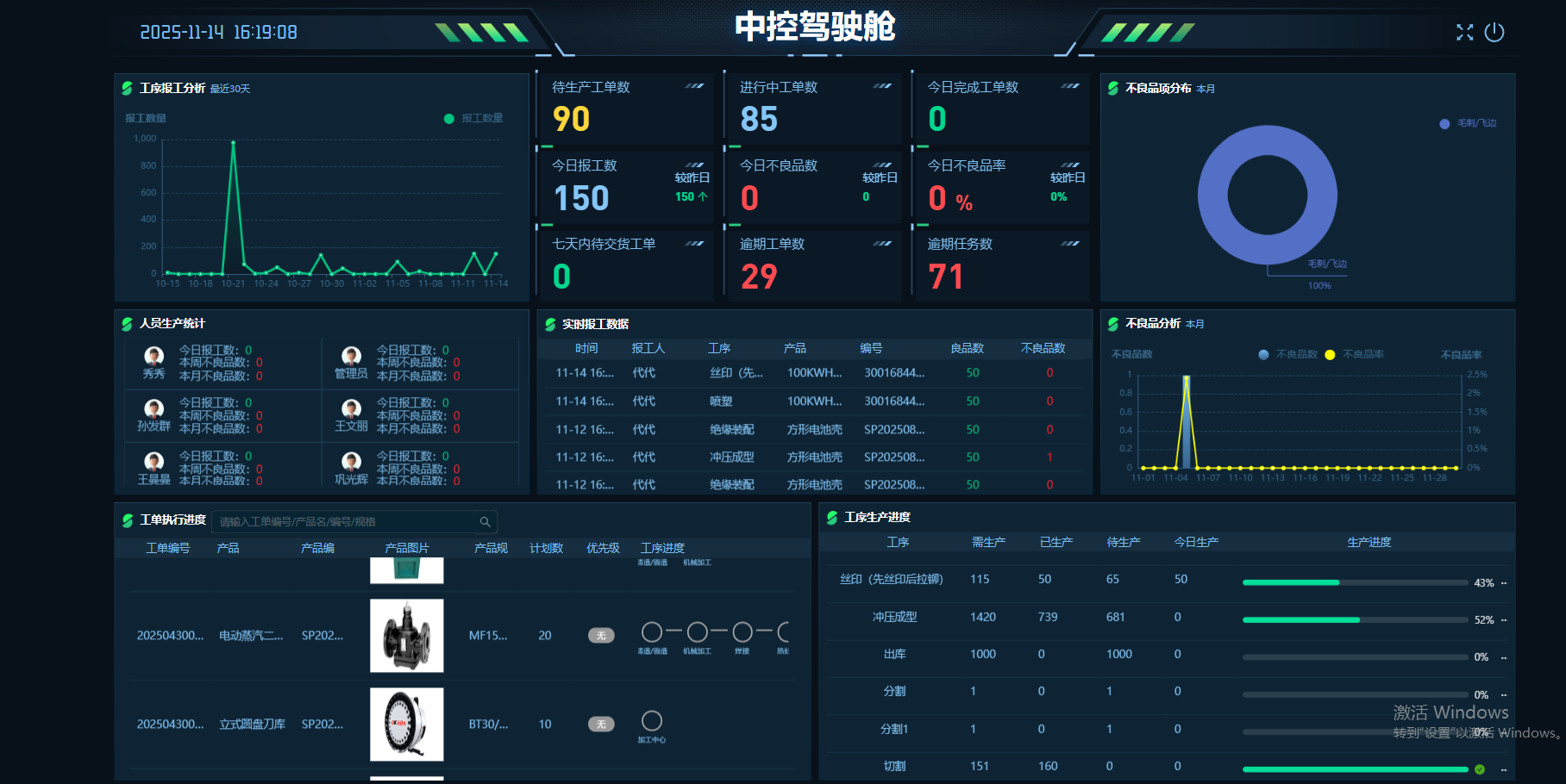 不用再踩着油污、听着机器轰鸣穿梭工位,只需坐在办公室的屏幕前,车间里的每一分动态都能实时 “跑” 到眼前。打开大屏,生产订单的全生命周期清晰得像 “透明账本”:哪张工单刚进入 “生产中”,哪批产品已经到了 “质检环节”,哪个订单距离交付日期还有多久,甚至每个工序的完成率、物料消耗情况,都以直观的图表、数字实时更新。再也不用靠 “问组长、查报表” 拼凑进度,鼠标一点,订单动态全掌握,客户追问交付时间时,再也不用慌慌张张去车间确认。