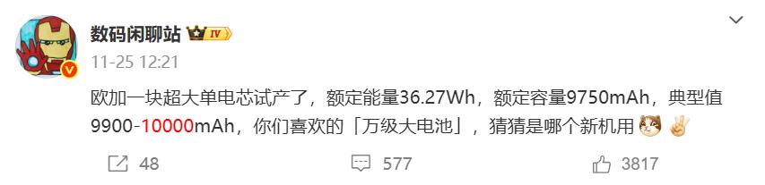 不过在还没达到万级水准之前,还不能说是大越级,但这个情景即将要来了,预计在元旦之后,厂商就要开始卷10000mAh大电池了,国产手机会进入到万级大电池竞争时代。