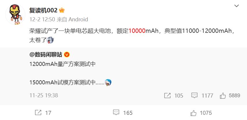 荣耀应该是最值得期待的,即将发布的万级电池手机还不止一款,会有好几款。