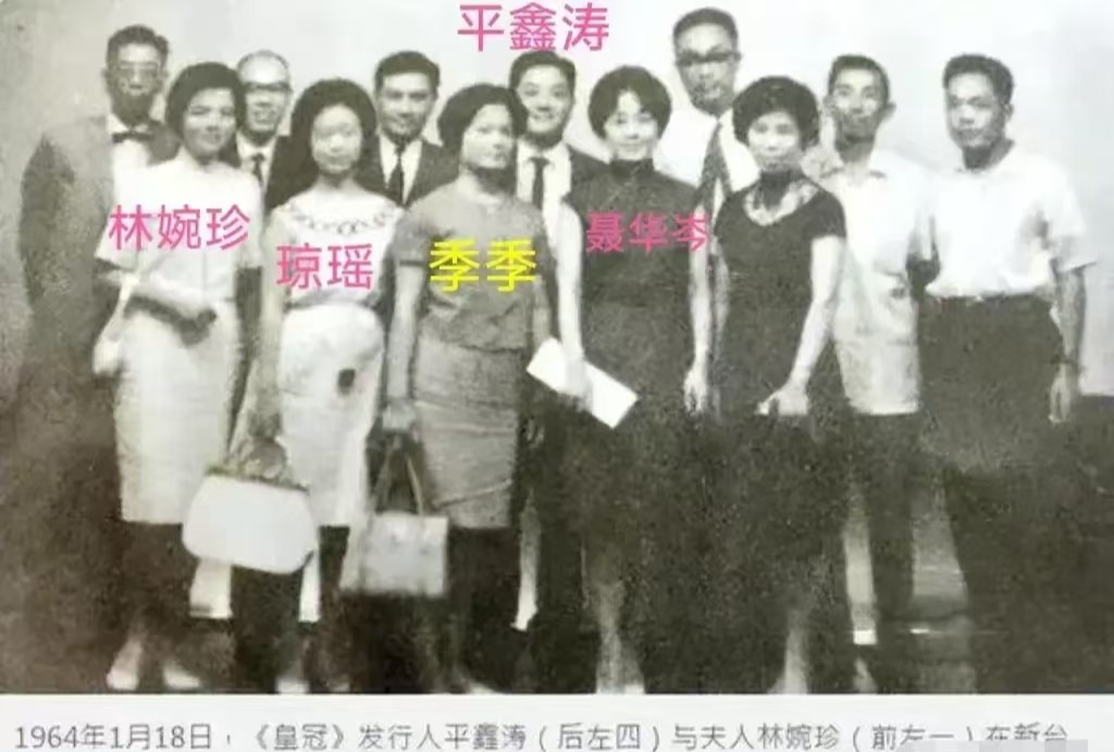 这张老照片是皇冠发行人平鑫涛与妻子林婉珍和皇冠第一批签约作家的合影,有琼瑶,还有后来名声大噪的聂华苓,季季站在琼瑶旁边,她当时只有19岁,是最年轻的。