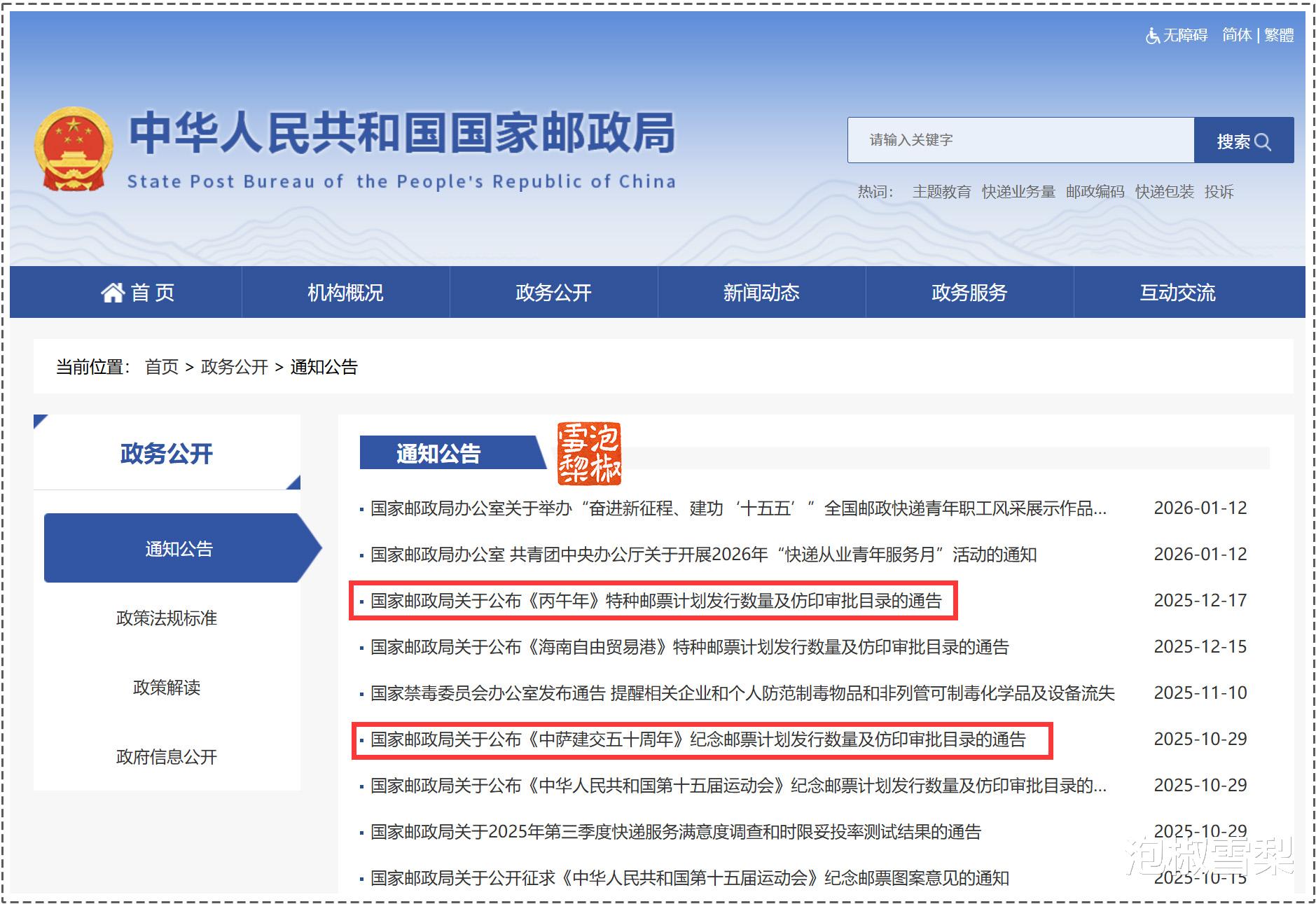 2.中华人民共和国国家邮政局:通知公告中比中国邮政提前公布邮票信息。