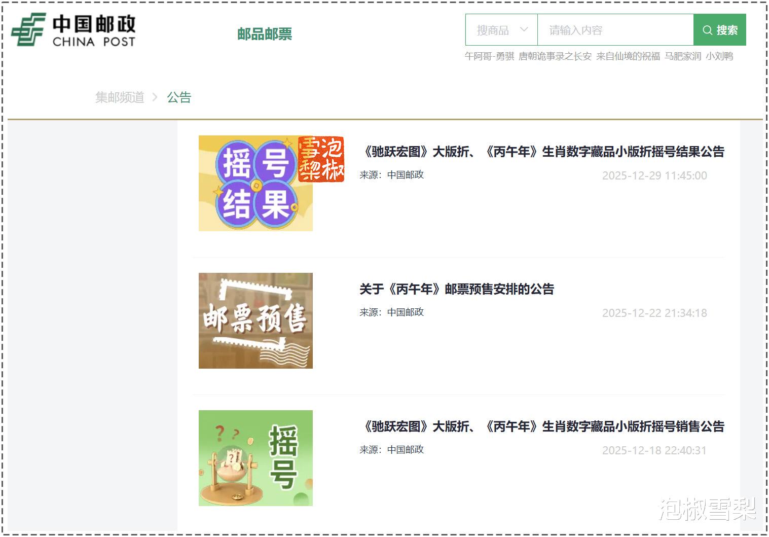4.中国邮政集邮频道公告:可查询将要发行邮票的发售日期以及摇号信息。