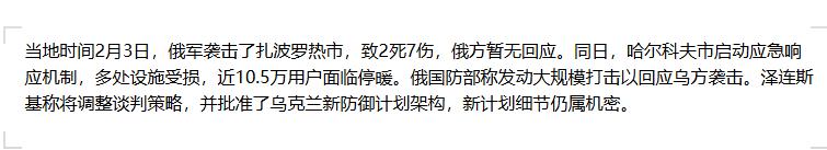 结语:留给乌克兰的时间确实不多了,随着远东基地的轰炸机群随时准备起飞,以及新一轮导弹生产周期的完成,2月3日的这次轰炸可能仅仅是一个更大规模行动的序幕。