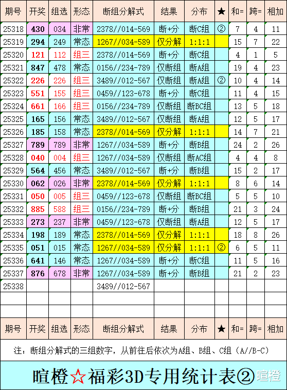 25338期:暄橙福彩3D综合条件(本期将在12月18日21:15开)一、上期回顾 ☆1、上期开奖号:8 7 6。2、和值= 21,跨度= 2。3、非常态组六,012路组合。4、热度分布(热:温:冷)1:1:1。二、本期条件 ☆1、三期缺码:239。2、热:0158,温:67,冷:2349。3、断组分解式:3489//012-567。4、四胆:3456;三胆:346。三、术语解释 ☆1、三期缺码:0至9这十个自然数当中,未在近三期开奖号出现的数字。2、热度(热温冷):自然数0至9,在近七期开奖号中,出现3次及3次以上的数字,称为热码;出现2次的数字,称为温码;出现1次和未出现的数字,称为冷码。某个数字在开奖号中出现几个,就按几次计算。3、断组分解式:将0至9这十个自然数,分成三组数字,从前往后依次为A组(4码)、B组(3码)、C组(3码),一般情况下,有一组数字不出码,偶尔会有两组数字不出码。A组不出码的情况相对较少。断组为主,分解为辅。4、常态组六号码:同时包含大数、小数、奇数、偶数、质数、合数的组六号码,共有72注。统计表中,简称“常态”。5、非常态组六号码:全大数、全小数、全奇数、全偶数、全质数、全合数等六种形态的组六号码,共有48注。统计表中,简称“非常”。★提醒:彩市有风险,参与须谨慎!理性购彩,量力而行!多看少买,不要痴迷!任何条件都有出错的时候!水平有限,仅供参考!友好互动,好运相伴!