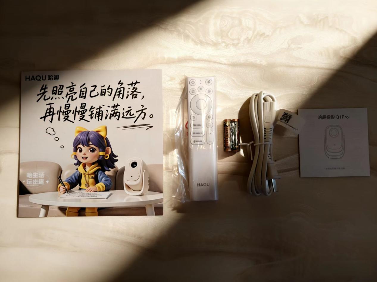 拆开哈趣Q1 Pro的包装后,第一感觉就是小巧实用,卡通的包装盒印着品牌名称和产品示意图,打开后投影仪主体、遥控器、AC电源线、说明书、感谢卡等整整齐齐摆放着,配件齐全且做工扎实。遥控器是极简设计,按键清晰易懂,还自带电池,拆开就能用,不用额外准备,细节贴心。