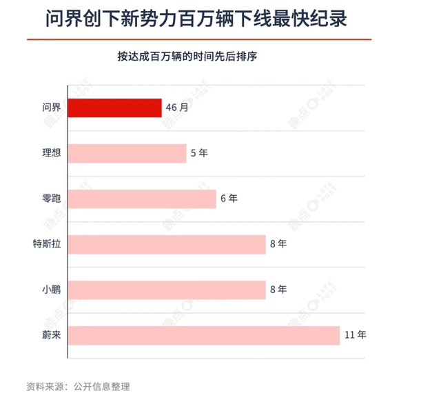 结果如下图的所示,问界达成100万台下线的时间,是46个月,接近4年,而其它品牌最快的是理想,花一5年,零跑花了6年,特斯拉花了8年,小鹏也是8年,蔚来则是11年。
