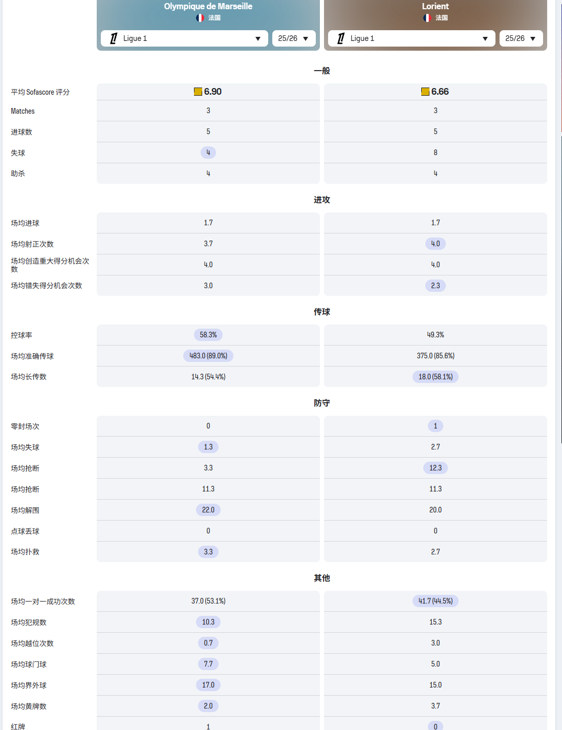 2、数据解析马赛:马赛前三轮场均控球率58.6%,场均进球1.7个,场均丢球1.3个,单从前三轮数据来看,马赛防守存在明显不足,不过关窗前进补阿格尔德和帕瓦德能相对修补防守漏洞。近十次面对洛里昂保持不败,主场更是五连胜,优势明显。洛里昂:洛里昂前三轮场均控球50%,作为升班马球队打法比较开放,由此放大防守漏洞,场均丢球2.7个,毕竟上轮1-7惨败里尔,把场均丢球数据拉高了很多,不过也符合球队的防守能力。进攻端场均进球1.7个,但反映在比赛中也只有4-0大胜雷恩打出了质量不错的进攻,上赛季在法乙客场丢分严重,客场能力明显不足。