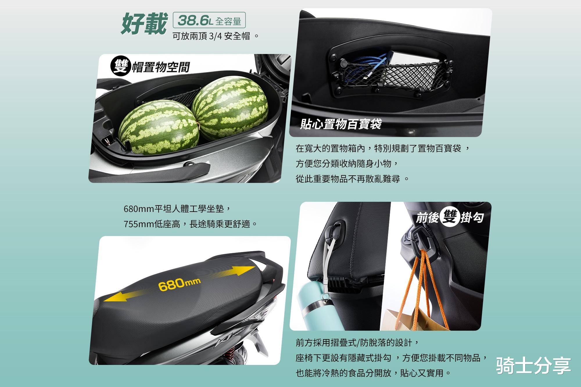 与此同时特仕版还将座桶加大到了38.6升,可以放两顶3/4头盔或者两个大西瓜,并有680mm长坐垫、中置挂钩、开放式储物格、6.4升前置油箱等贴心设计,因此这款车的实用性还是比较突出的,尤其在载物便捷性上可以算是非常用心。