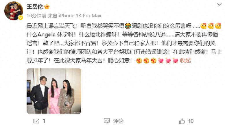 1月26日,王岳伦发文:“最近网上谣言满天飞!听着我都哭笑不得😂编剧也没你们这么厉害呀…什么Angela 休学呀!什么缅北诈骗呀!等等各种胡说八道……请大家不要再传播谣言!散了吧…大家都不容易!”