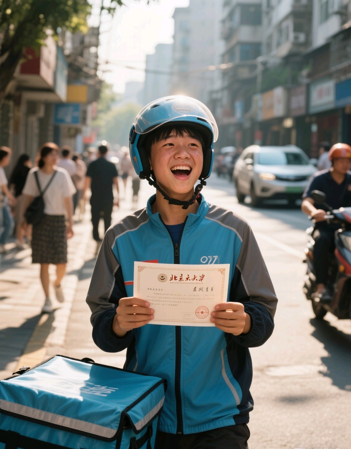8月2日,是王佳皓人生的高光时刻。北京大学的录取通知书翩然而至,彼时,他正奔波在送第38单外卖的路上。父亲打来电话,激动地告知他这个好消息,那一刻,王佳皓心中的激动难以言表。但他没有立刻停下手中的工作,而是送完最后一单,才匆匆赶回家,捧起那份满载梦想的通知书。