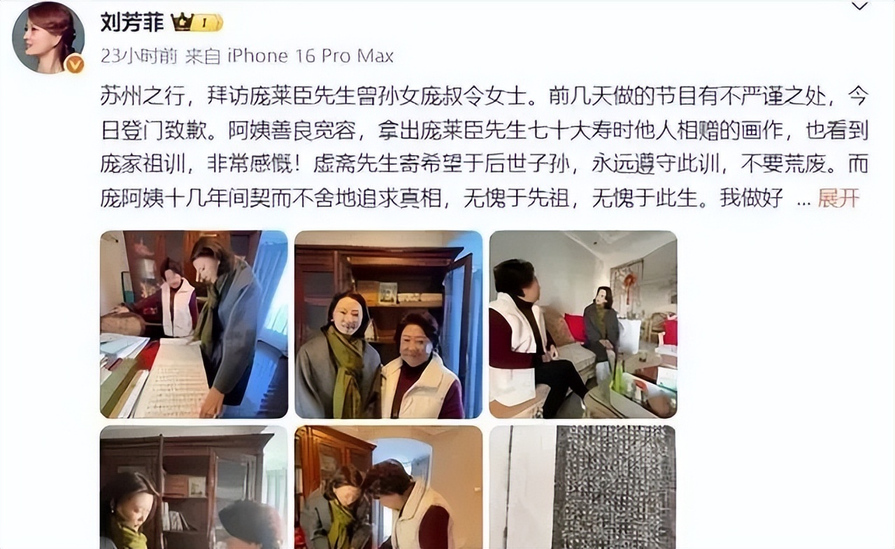 在得知真相后,她于2025年12月26日专程赴苏州登门向庞莱臣真正的曾孙女庞叔令道歉。刘芳菲态度诚恳,表示节目存在不严谨之处,愿澄清谬误、弘扬虚斋文化。