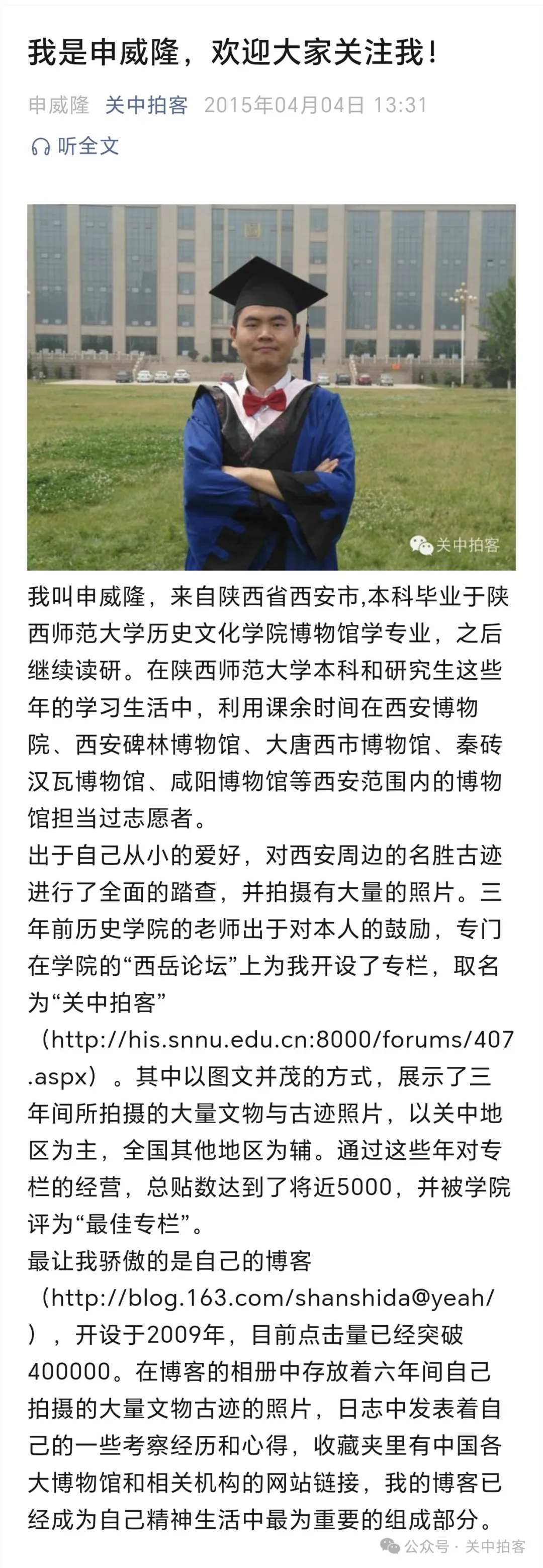 2015年4月4日,我在“关中拍客”微信公众号上,发布《我是申威隆,欢迎大家关注我!》,立马获得老师、同学、家人、朋友的广泛关注和大力支持。如今,回头翻看,青涩的文字,凌乱的排版,仿佛还是昨日……