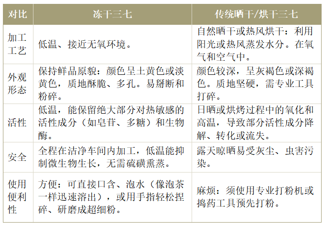 研究表明,通过冷冻干燥机处理的三七,其皂苷含量与新鲜三七接近,且显著高于传统干燥方法所得成品。冷冻干燥机制作的冻干三七在复水性、质地疏松度,便于后期的切分粉碎,更利于制剂加工。