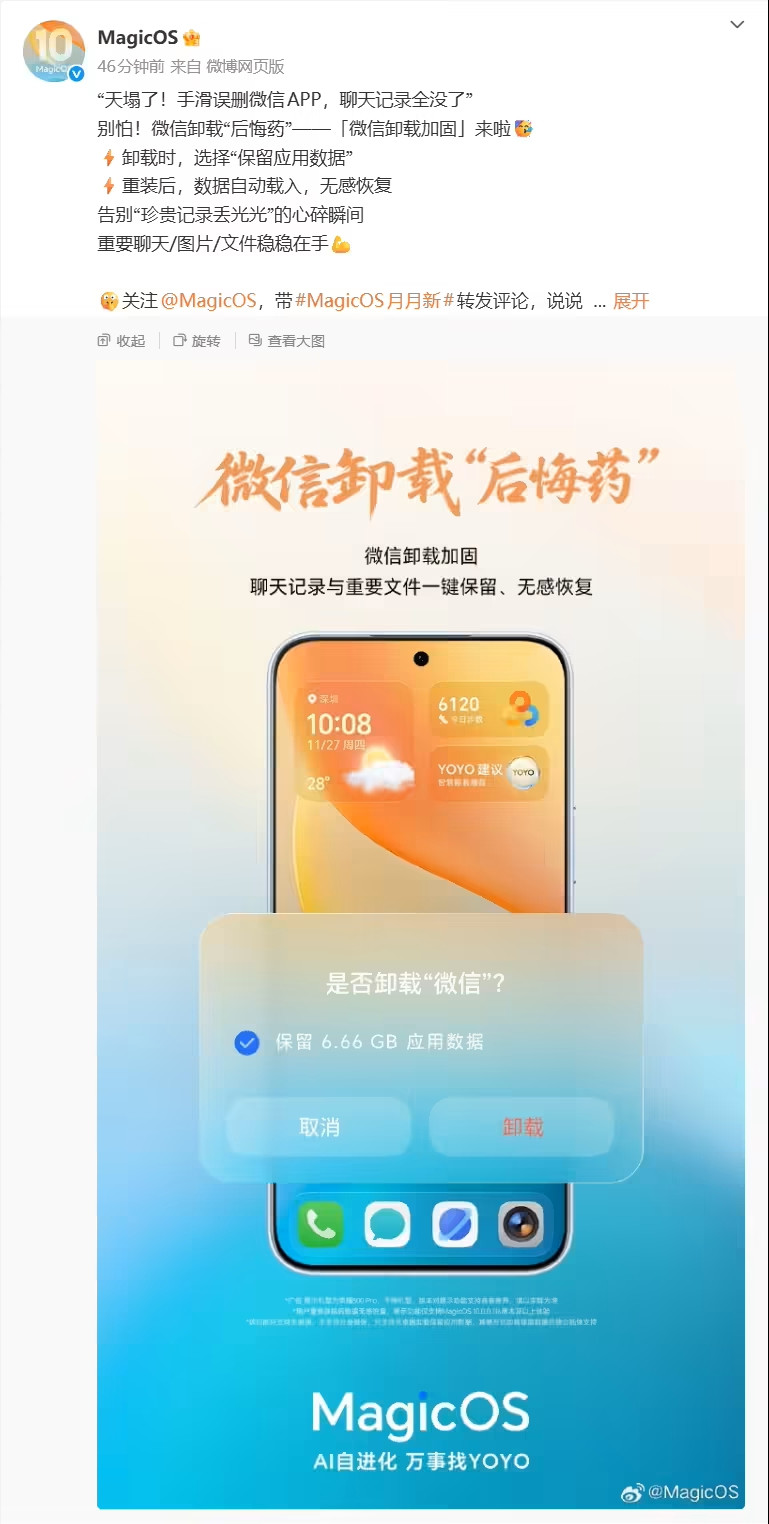 11月28日,荣耀公布了“微信卸载加固”功能,卸载微信时会默认保留应用数据(要手动再点击一次才是连带数据一起删除),只要重装微信的app就能无感恢复数据。