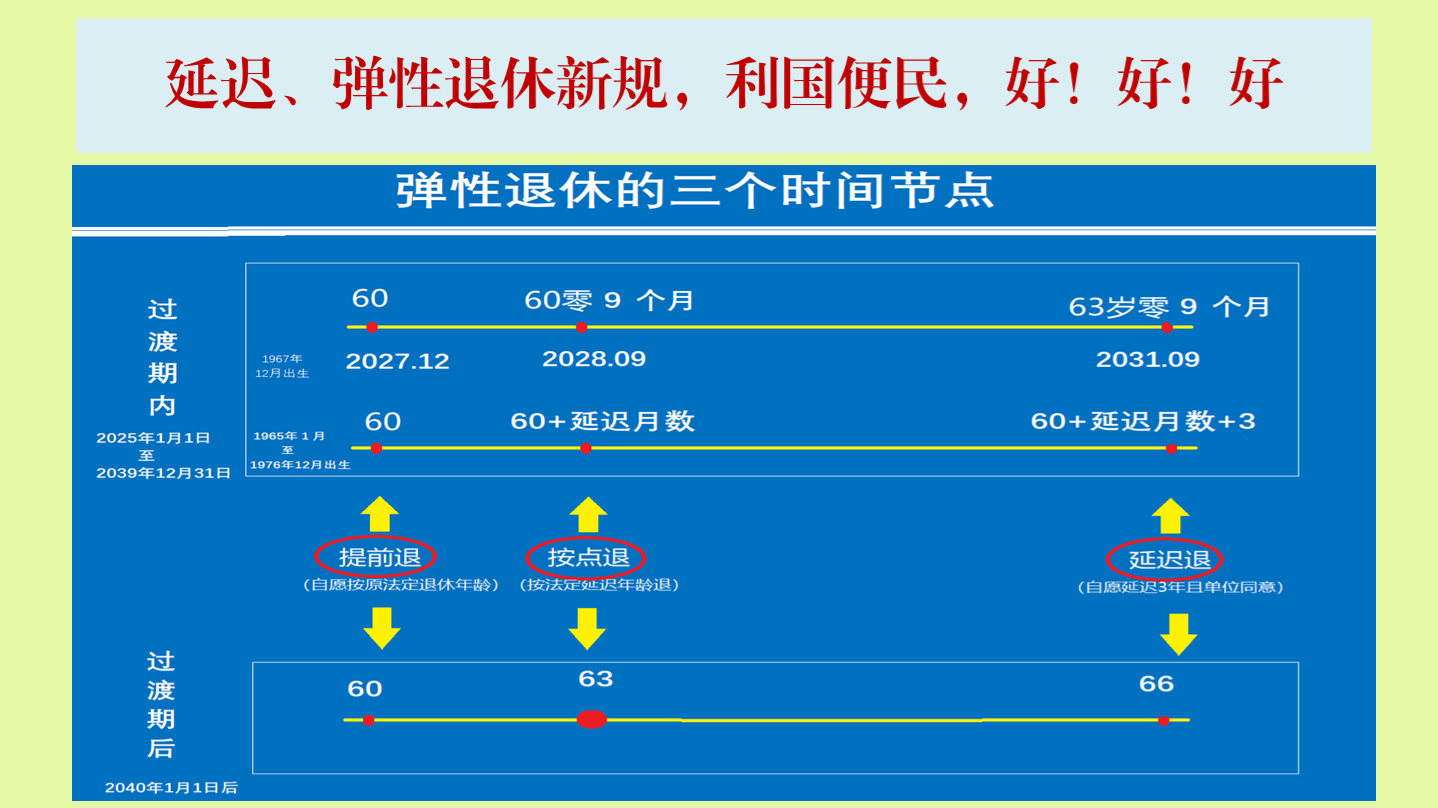 新退休办法实现弹性制——以正点退年龄为坐标,可以向前弹性提前退,也可以向后弹性延迟退。各不超过3年。