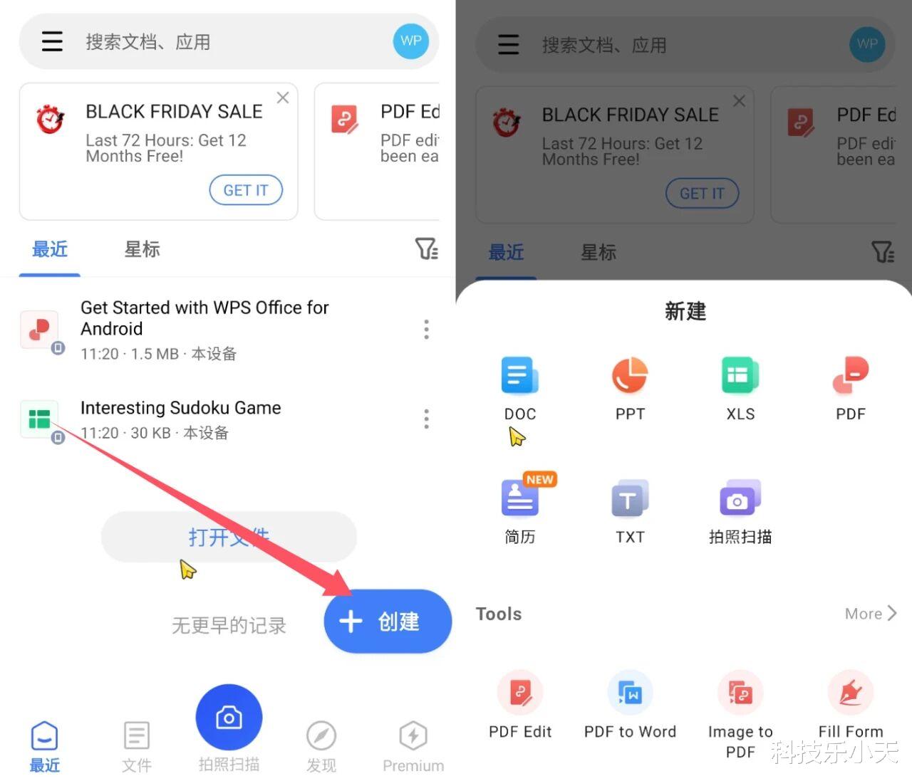 在最近页面中点击创建,你可以随意新建并编辑文档、表格、PPT、PDF等格式的文件。