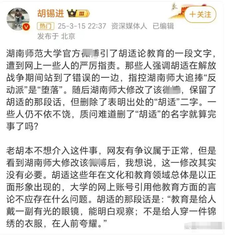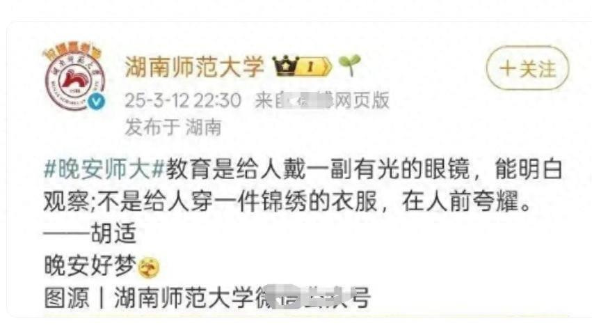 湖南师范大学在3月12日植树节当天,官方号引用了一句胡适的一句名言:“教育是给人戴一副有光的眼镜,能明白观察;不是给人穿一件锦绣的衣服,在人前夸耀。”但是估计由于署名胡适引起了不少人的反感,过了一会儿删除了胡适的署名。