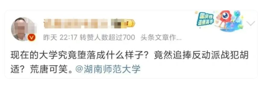 大V胡锡进发声,指责删除行为不妥!知名大V胡锡进对此事发表了看法,他直指湖南师范大学的做法是在退步,删除署名是一种懦弱的表现,缺乏应有的态度。胡锡进认为,时代已经发展到今天,我们应该对历史人物有更加包容的态度,这样才能让社会更有张力。