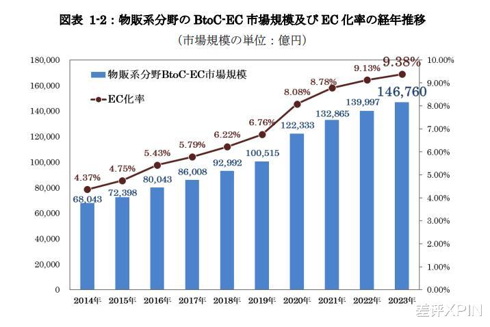 日本经济产业省《令和 5 年度電子商取引に関する市場調査 》显示, 2023 年物贩系分野的 BtoC-EC (实体商品的线上交易 )市场规模有 14 兆 6760 亿日元(大约人民币 6.8 万亿 ),相比去年增长了 4.83% , EC 化率也来到了 9.38% 。